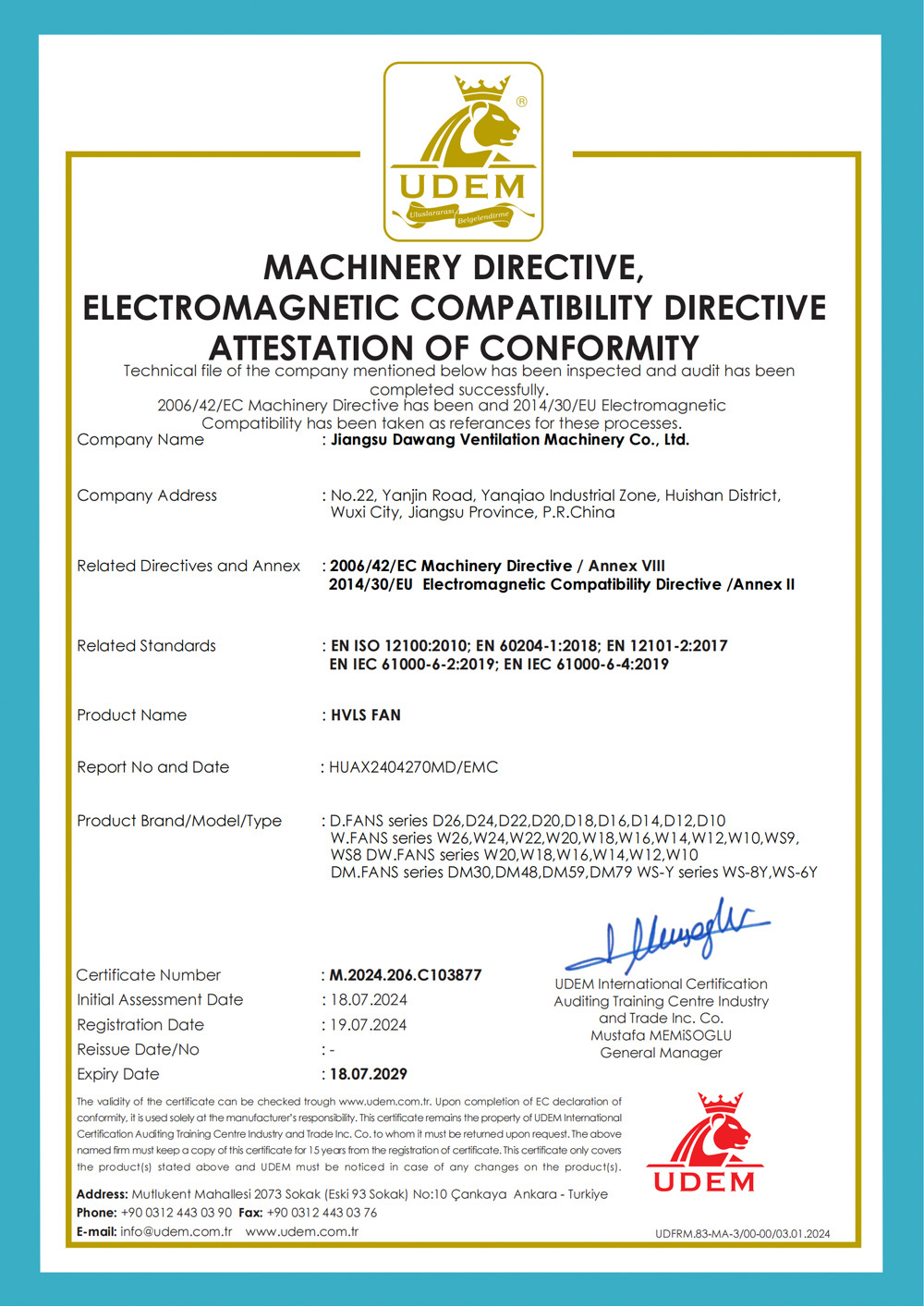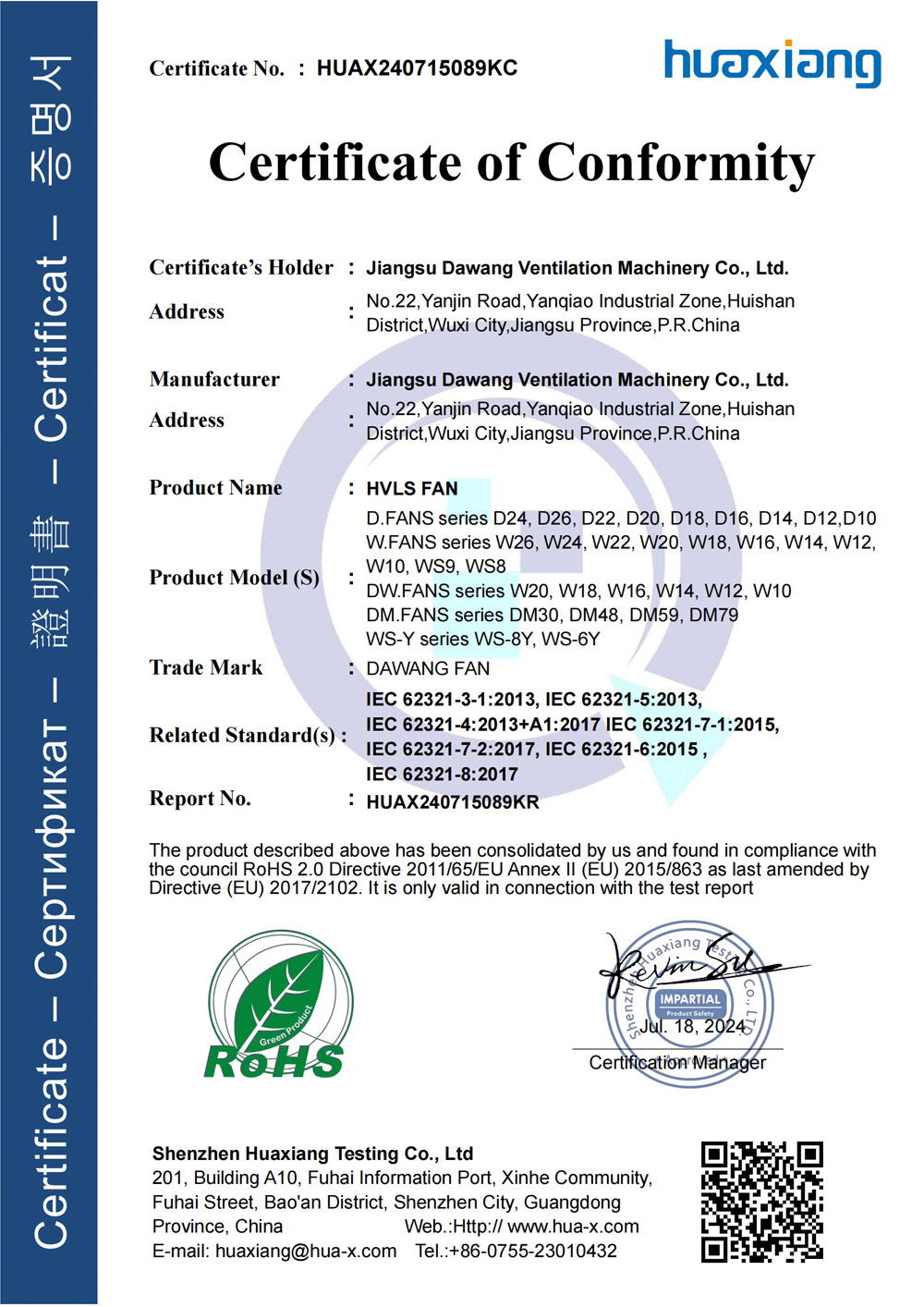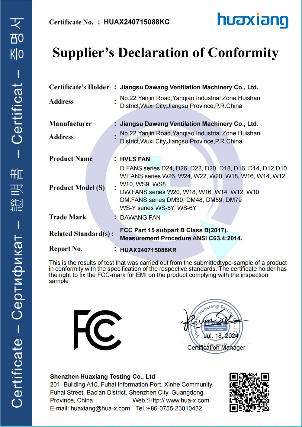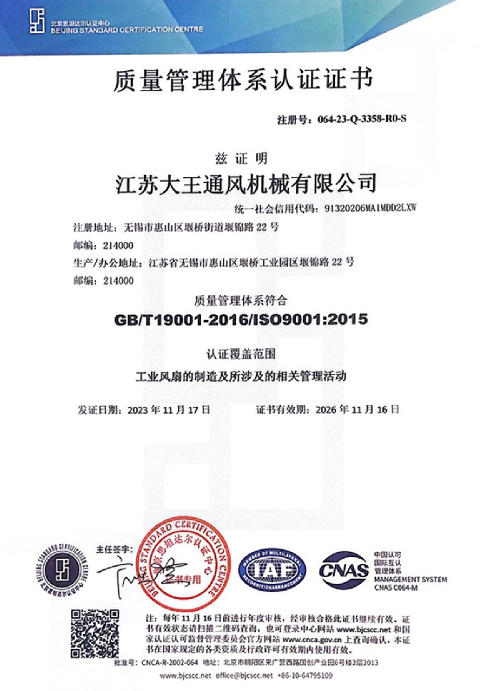 大王通風通過IS09001:2015質(zhì)量管理體系認證、職業(yè)健康安全管理體系、行業(yè)首家五星售后服務資質(zhì)認證、德國萊茵(TUV)深度驗廠;榮獲“高新技術企業(yè)”、“無錫市雛鷹企業(yè)”、“十佳科技創(chuàng)新企業(yè)”等多項榮譽,擁有45+項專利,產(chǎn)品擁有完整的專利知識產(chǎn)權,通過FCC、CE、ROHS、CCC、CSA、GL、UL認證,關鍵部件通過國家權威機構檢測。